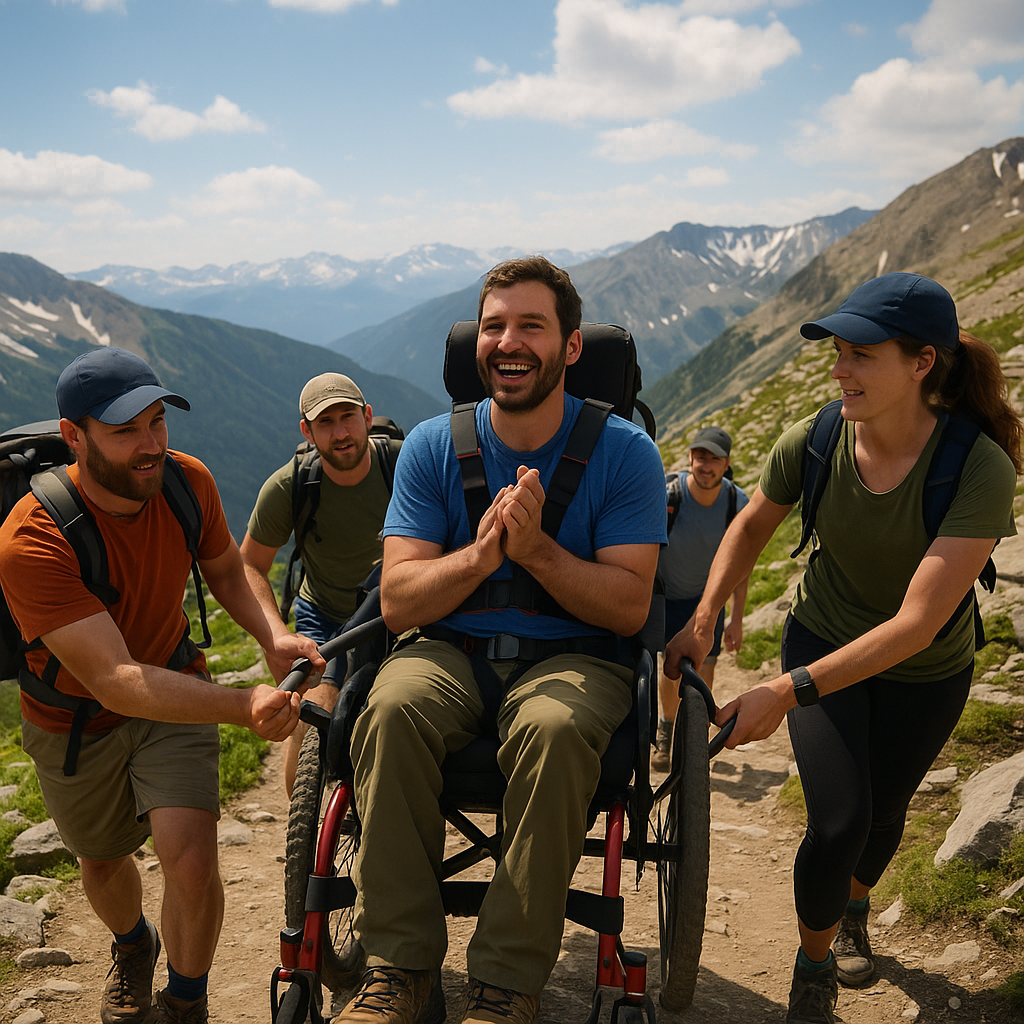 On a bright Saturday morning, the team gathered at the trailhead. Daniel, strapped safely into a supportive seat, was lifted by two hikers at a time, while others carried his supplies. The climb was steep, but the hikers encouraged each other, laughing, sweating, and cheering along the way.
