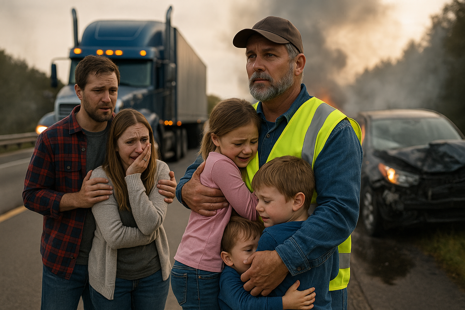 In a split second, one man’s courage changed everything. The Smith family walked away from a crash that could have taken their lives—all because a truck driver chose to stop, step in, and save them.
